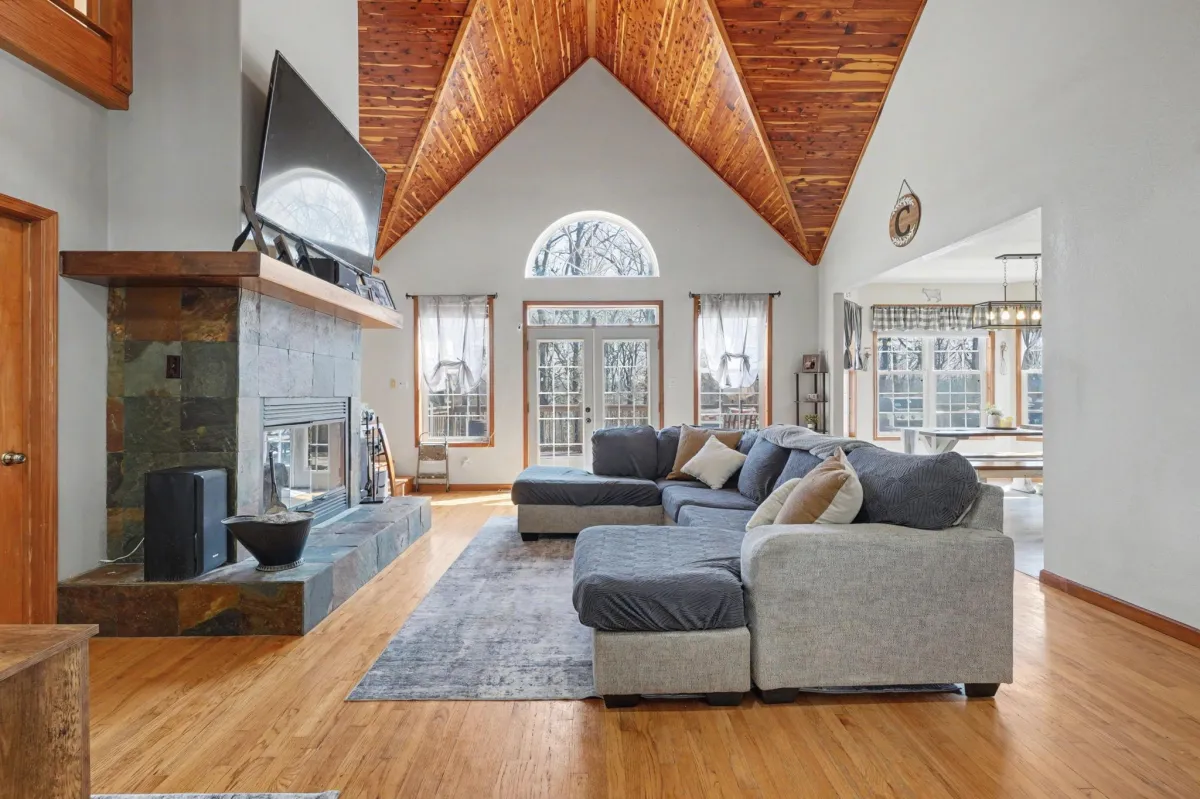 Step into the stunning great room, where a soaring wood ceiling, cozy fireplace, and French doors frame peaceful views of the surrounding landscape creating an inviting space for both everyday living and entertaining.